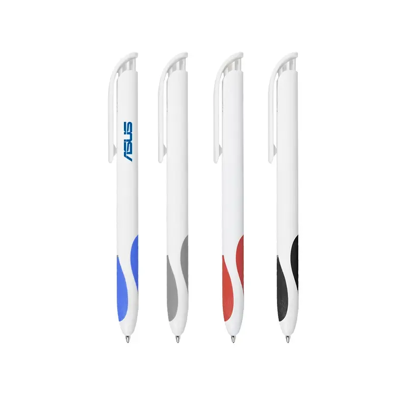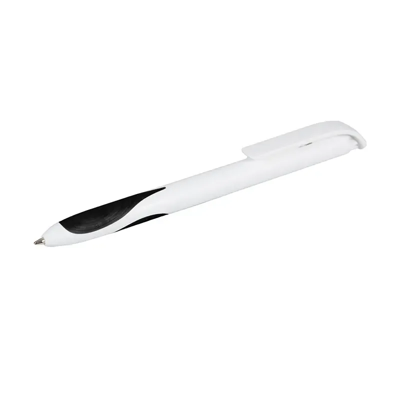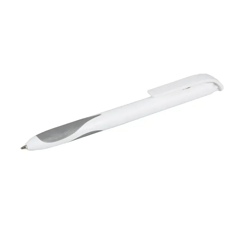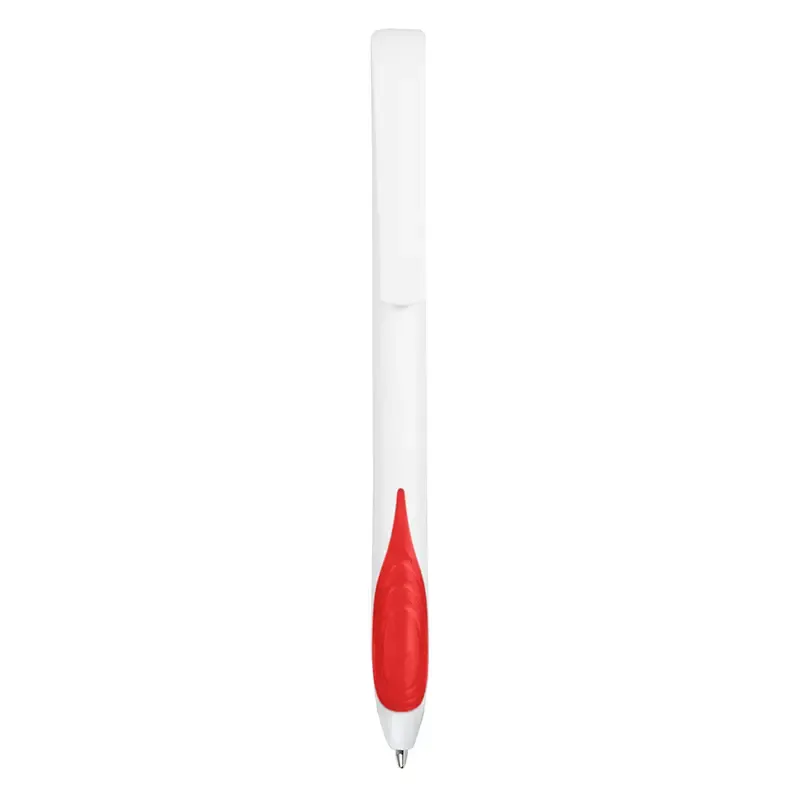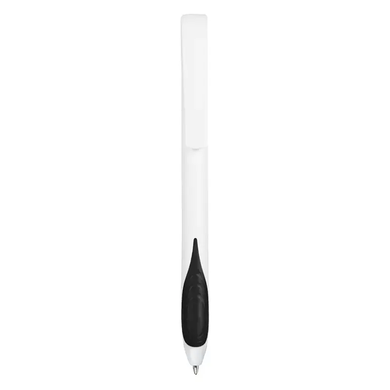 Bolígrafo plástico de cuerpo y clip en color blanco. Grip en TPR de color. Apertura con pulsador. Tinta Negra 500 m de longitud de escritura. Zecat.